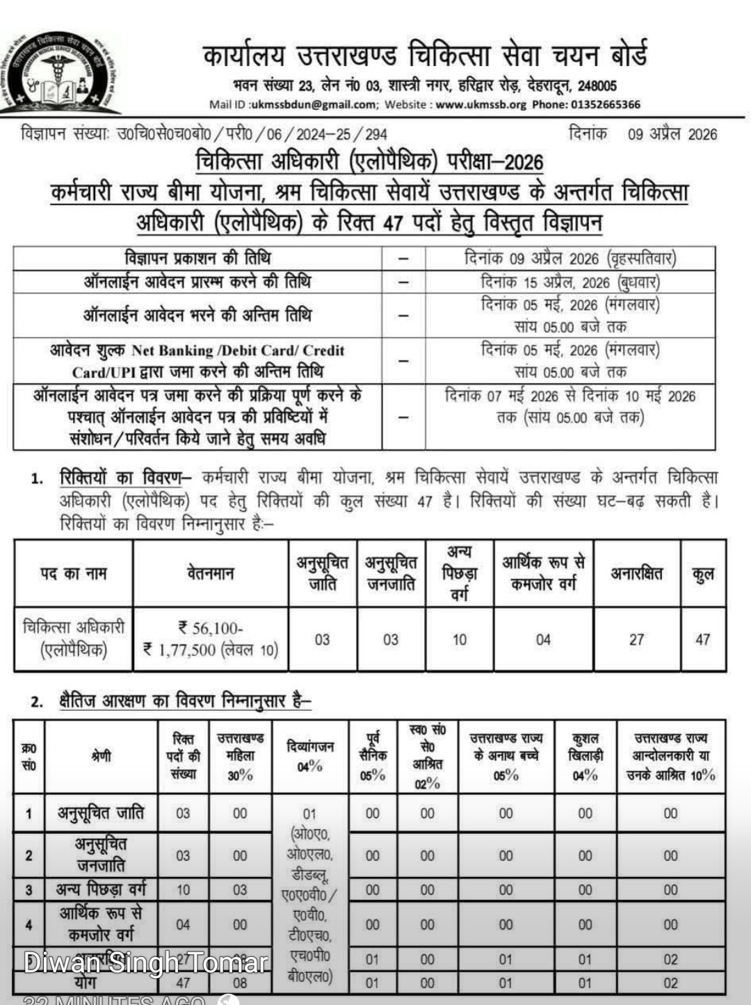 उत्तराखंड में चिकित्सा अधिकारी के 47 पदों पर भर्ती, आवेदन प्रक्रिया 15 अप्रैल से शुरू सम्पादक देवेन्द्र सिंह राय देहरादून। उत्तराखंड चिकित्सा सेवा चयन बोर्ड