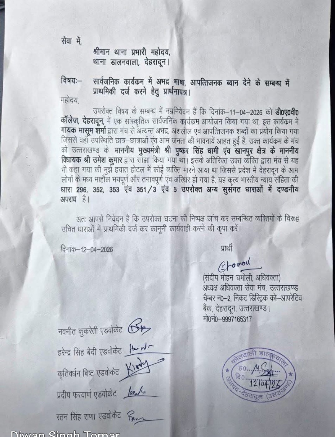 देहरादून से बड़ी खबर सामने आ रही है, जहां एक सार्वजनिक कार्यक्रम के दौरान कथित आपत्तिजनक बयान को लेकर विवाद खड़ा हो गया है। हरियाणवी