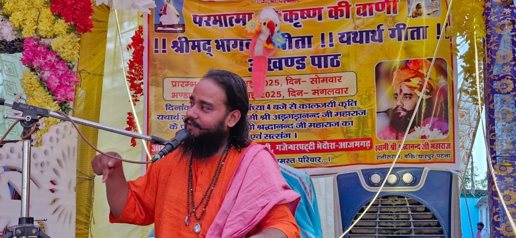 आवश्यकता है और जो जहां भी है जिस भी देश काल परिस्थिति में है वो वहीं यथार्थ गीता की वाणी को फैलाये, यथार्थ गीता की वाणी को फ़ैलाने वाला और वाणी को सुनने वाला दोनों के हृदय में पूज्य श्री गुरुदेव भगवान प्रेरक बनकर मार्गदर्शन करने लगेंगे चूंकि पूज्य श्री गुरुदेव भगवान विश्व के कण-कण में व्याप्त है वे वहीं से हृदय से रथी होकर पूरे विश्व में जागृत हो जायेगें बसर्ते कि गीतोक्त साधना का पालन करें। उन्होंने बताया कि भारत कनफुकवा गुरु से विश्व गुरु नहीं बनेगा भारत पूज्य श्री गुरुदेव भगवान की कृपा उनकी गीतोक्त साधना से विश्व गुरु बनेगा। उन्होंने बताया कि गीता आदि धर्म- शास्त्र है इसी की वाणी को ईसा मूसा कबीर तुलसी रैदास आदि महापुरुषों ने बताया है कोई नई चीज नहीं। उन्होंने बताया कि यथार्थ गीता पूज्य श्री गुरुदेव भगवान ईश्वरीय आदेश से लिखा है इसमें एक ईश्वर एक धर्म ईश्वर को पाने का एक मार्ग एक कर्म एक यज्ञ आदि का वर्णन है। यह पूर्णतः मजहब मुक्त मानव मात्र के लिए है। यह किसी विशेष जाति धर्म की हिमायती नहीं है यह विश्व में बसे मानव के मोक्ष हितार्थ बात करती है इसलिए यह ईश्वरीय वाणी है। श्री श्रद्धा महाराज जी ने बताया कि हमें भारत को पूज्य श्री गुरुदेव भगवान के मिशन में शामिल होकर भारत के बच्चे – बच्चे को विश्व गुरु बनाने में लग जाना चाहिए। श्री श्रद्धा महाराज जनपद आजमगढ़ के तहसील बूढ़नपुर अंतर्गत कमालपुर गोपालीपट्टी भक्त सुरेश पाल के घर बहुभोज के शुभ अवसर पर यथार्थ गीता पाठ में पहुंचे थे।