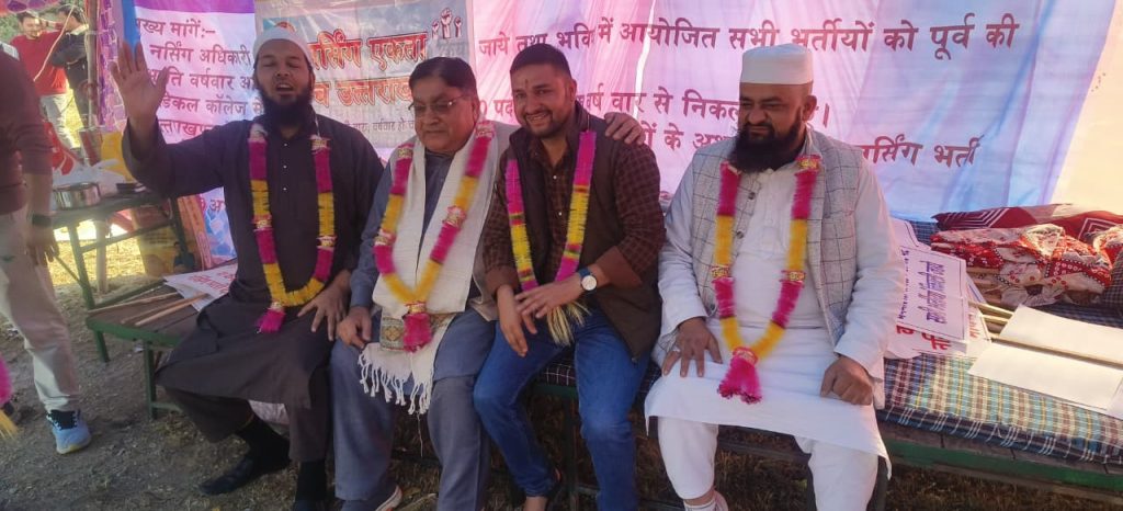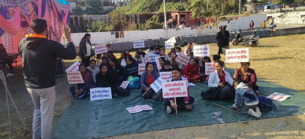 देहरादून। नर्सिंग भर्ती में कथित गड़बड़ियों और नई विज्ञप्ति के विरोध में नर्सिंग एकता मंच का धरना शनिवार को लगातार तीसरे दिन भी जारी रहा। प्रदेश के विभिन्न जिलों से बड़ी संख्या में बेरोज़गार नर्सिंग अधिकारी तिब्बती मार्केट के समीप धरना स्थल पर जुटे और सरकार के खिलाफ जोरदार प्रदर्शन किया।