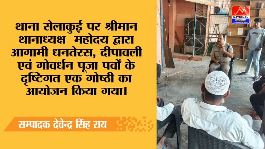 आज दिनांक 15 अक्टूबर 2025 को थाना सेलाकुई पर श्रीमान थानाध्यक्ष महोदय द्वारा आगामी धनतेरस, दीपावली एवं गोवर्धन पूजा पर्वों के दृष्टिगत एक गोष्ठी का आयोजन किया गया। इस गोष्ठी में व्यापार मंडल पदाधिकारियों, क्षेत्र के प्रतिष्ठित व्यापारीगण ने प्रतिभाग किया। बैठक में थाना क्षेत्र में त्योहारों के दौरान भीड़-भाड़, ट्रैफिक व्यवस्था, अतिक्रमण, सुरक्षा व्यवस्था, वाहन पार्किग, अग्नीशमन वाहन हेतु पर्किग आदि विषय पर विस्तृत चर्चा की गई। व्यापार मंडल पदाधिकारियों ने भी पुलिस को पूर्ण सहयोग का आश्वासन दिया। गोष्ठी में उपस्थित व्यापारियों को निम्नलिखित बिन्दुओ का पालन करने हेतु कहा गया।
