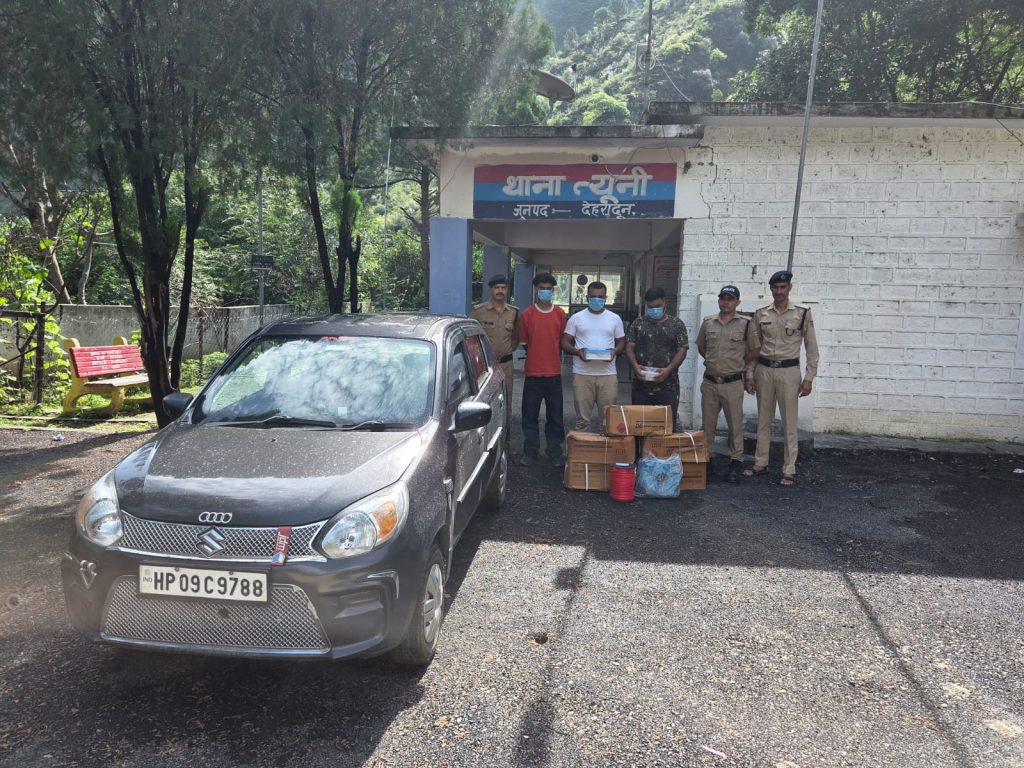 वर्तमान में पंचायत चुनाव के दृष्टिगत वरिष्ठ पुलिस अधीक्षक देहरादून द्वारा सभी थाना प्रभारियों को चुनाव प्रक्रिया को निष्पक्ष ढंग से सम्पन्न कराने व किसी भी प्रकार से प्रलोभन देकर मतदान अपने पक्ष में करने जैसी तमाम गतिविधियों पर रोक लगाते हुए अवैध गतिविधियों सतर्क दृष्टि रखने हेतु निर्देशित किया गया है, जिस पर संपूर्ण जनपद में पुलिस द्वारा लगातार सघन चेकिंग अभियान चलाया जा रहा है। इसी क्रम में दिनांक 10/07/2025 को त्यूणी पुलिस द्वारा चेकिंग के दौरान एक ऑल्टो कार संख्या HP 09C 9788 को चैक किया गया तो वाहन में 05 पेटी डायनामाइट कुल वजन 125 कि0ग्राम बरामद हुआ। वाहन सवार व्यक्तियों से उक्त विस्फोटक पदार्थ को परिवहन करने के संबंध में आवश्यक दस्तावेज मांगे गए तो हुए दिखा नहीं पाए, जिस पर अवैध विस्फोटक पदार्थ की बरामदगी पर थाना त्यूनी पर मु0अ0सं0 19/2025 धारा 3/7 विस्फोटक अधिनियम 1884 बनाम रिंकू, रोहित, सुनील, पंजीकृत किया गया।