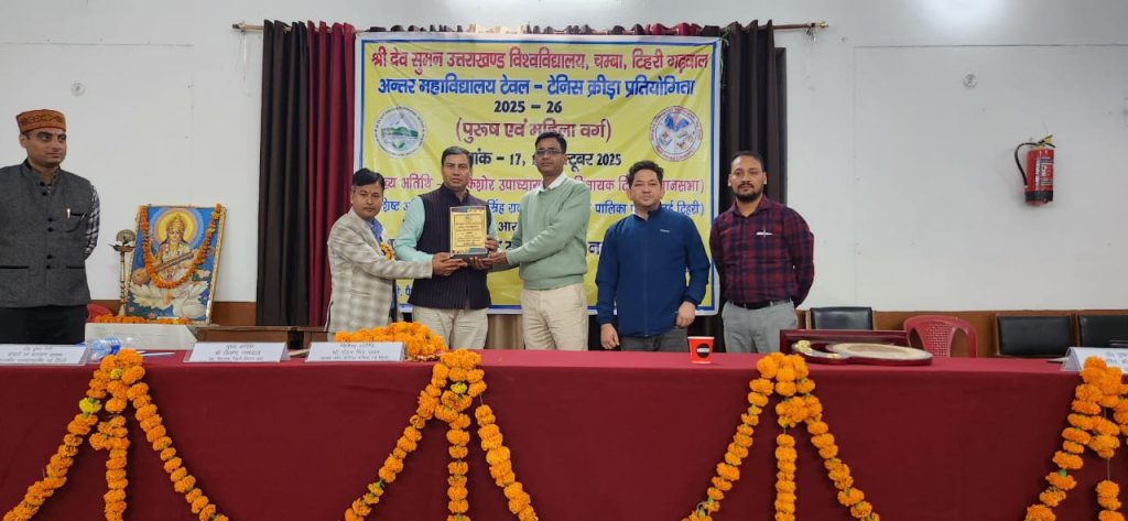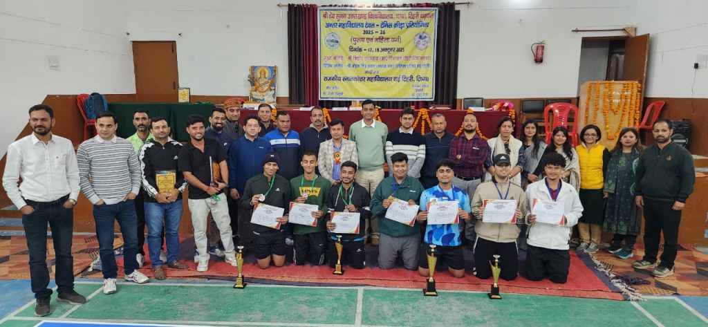 श्रीदेव सुमन विश्वविद्यालय के द्वारा आयोजित अंतर महाविद्यालय टेबल टेनिस प्रतियोगिता का समापन हो गया है l समापन के अवसर पर महाविद्यालय की प्राचार्य प्रोफेसर पुष्पा नेगी एवं विश्वविद्यालय के क्रीड़ा सचिव श्री पुष्कर गौड के द्वारा विजेता टीमों के प्रतिभागियों को मेडल एवं ट्राफियां बांटी गई l प्रतियोगिता की बालिका वर्ग में टीम