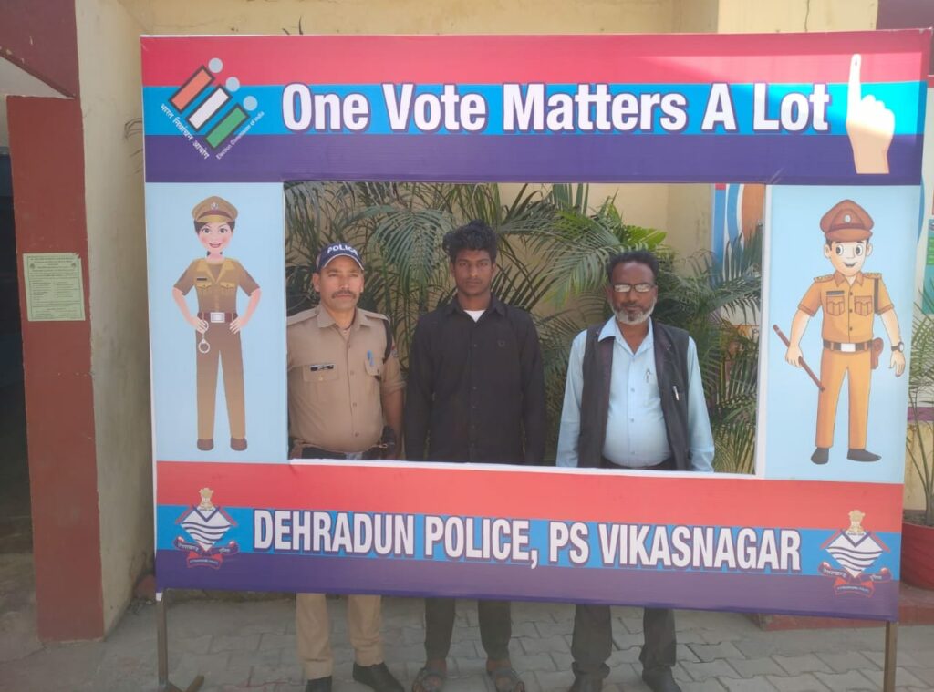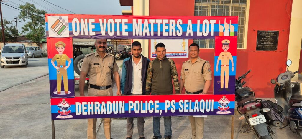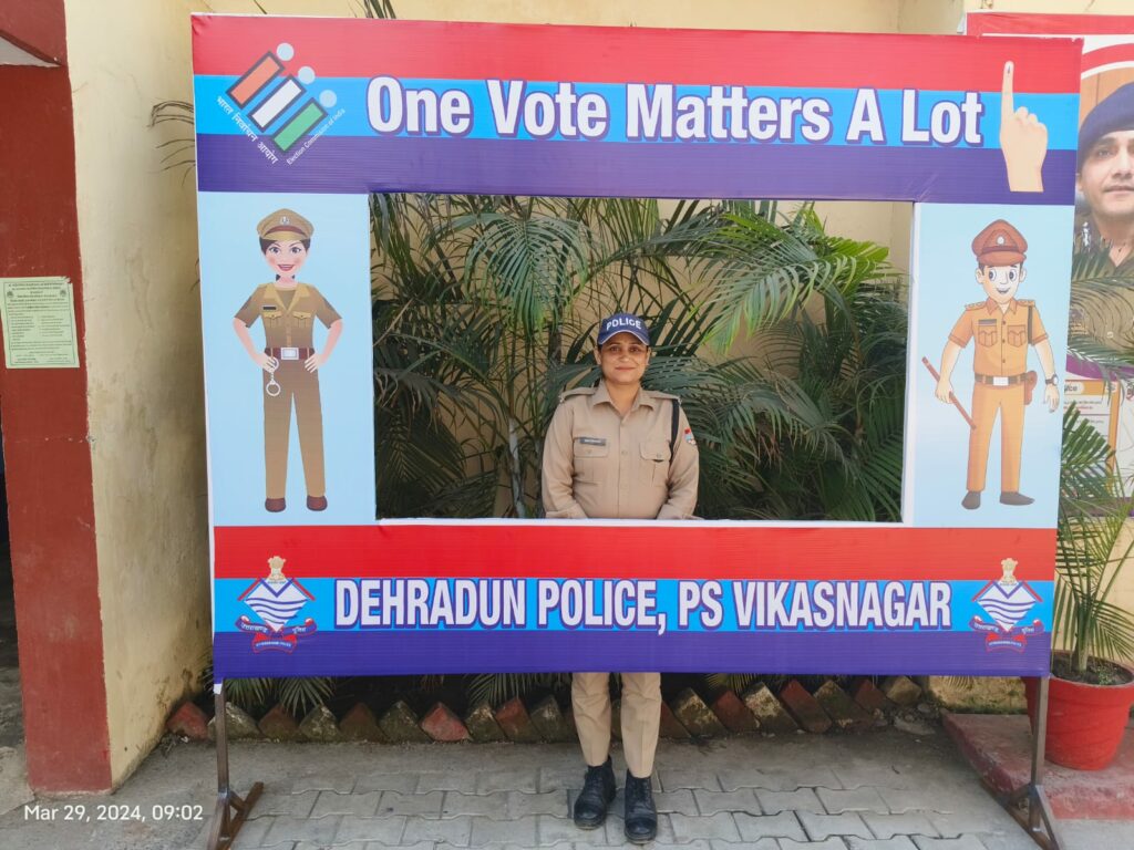 आगामी लोकसभा निर्वाचन 2024 के दृष्टिगत वरिष्ठ पुलिस अधीक्षक देहरादून द्वारा सभी अधीनस्थों को अपने-अपने थाना क्षेत्रों में आम जनमानस को निर्भीक होकर मतदान के लिए जागरूक करने तथा लोगो को उनके वोट के महत्व के बारे में समझाते हुए उन्हें अपने मताधिकार का प्रयोग करने के लिए प्रेरित करने के निर्देश दिए गए है, इसी क्रम में जनपद पुलिस द्वारा एक नई पहल की शुरुआत करते हुए जनपद के सभी थानों में *”ONE VOTE MATTER A LOT”* के फ्लैक्स बोर्ड तथा सेल्फी पॉइंट बनाये गए है,