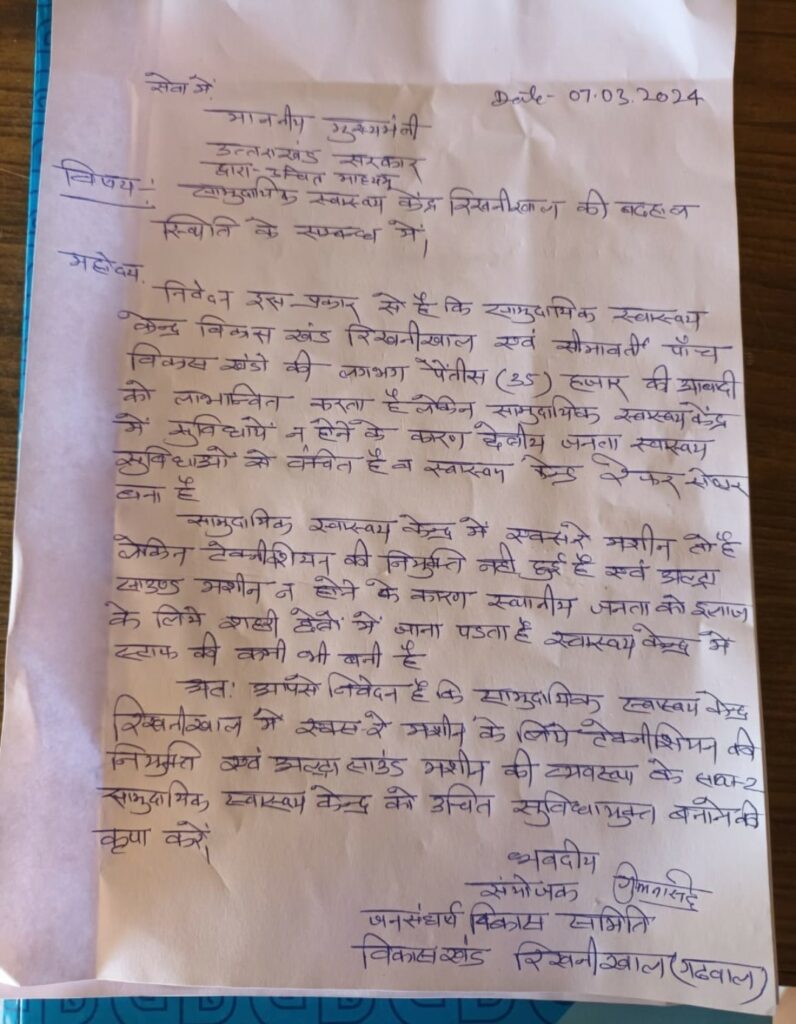 उन्होनें मांग की है कि सामुदायिक स्वास्थ्य केन्द्र रिखणीखाल में एक कुशल तकनीशियन की नियुक्ति व अल्ट्रासाउंड मशीन उपलब्ध करायी जाये।ताकि लोग रैफरल सेन्टर सा न पुकारें।