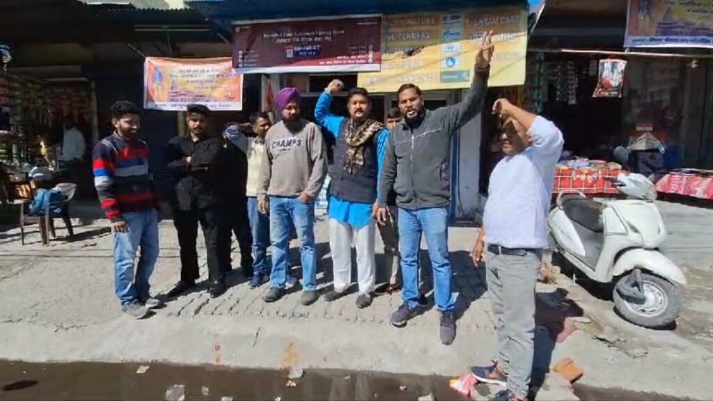 स्थानीय दुकानदारों ने वेदांत स्वीट सौंफ के सामने विभाग के खिलाफ किया प्रदर्शन किया