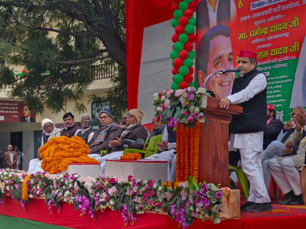 बूथ स्तरीय कार्यकर्ता बैठक अतरौलिया सपा कार्यालय में पहुंचे थे सांसद धर्मेन्द्र यादव