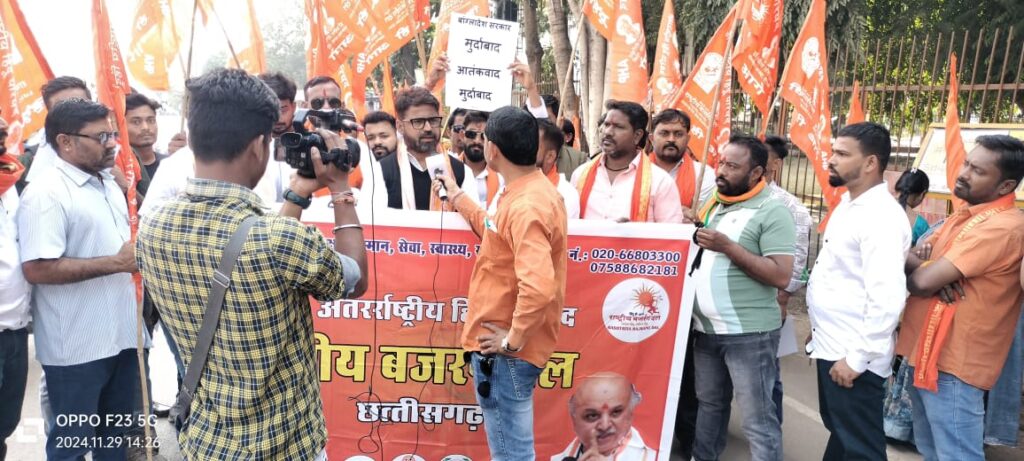 राजधानी रायपुर में राष्ट्रीय बजरंग दल द्वारा बांग्लादेश में हिंदुओं के ऊपर हो रहे अत्याचार पर जंगी प्रदर्शन करते हुए सरकार की उदासीन नीति पर अब राष्ट्रीय दल में काफी रोश व्याप्त होते दिख रहा है बांग्लादेश की सरकार द्वारा हिंदुओं के ऊपर अत्याचार दिन प्रतिदिन बढ़ते जाने पर कोई कठोर कार्यवाही और शक्त रवैया न दिखा पाना मुख्य तौर पर मुख्य मुद्दा माना जा रहा है जिसको लेकर सरकार की अत्याचार रवैया से उग्र होते हुए राजधानी में राष्ट्रीय बजरंग दल के द्वारा बांग्लादेशी सरकार का पुतला दहन किया गया है बजरंग दल ने भारत सरकार को दो टूक कहते हुए कहा कि अगर