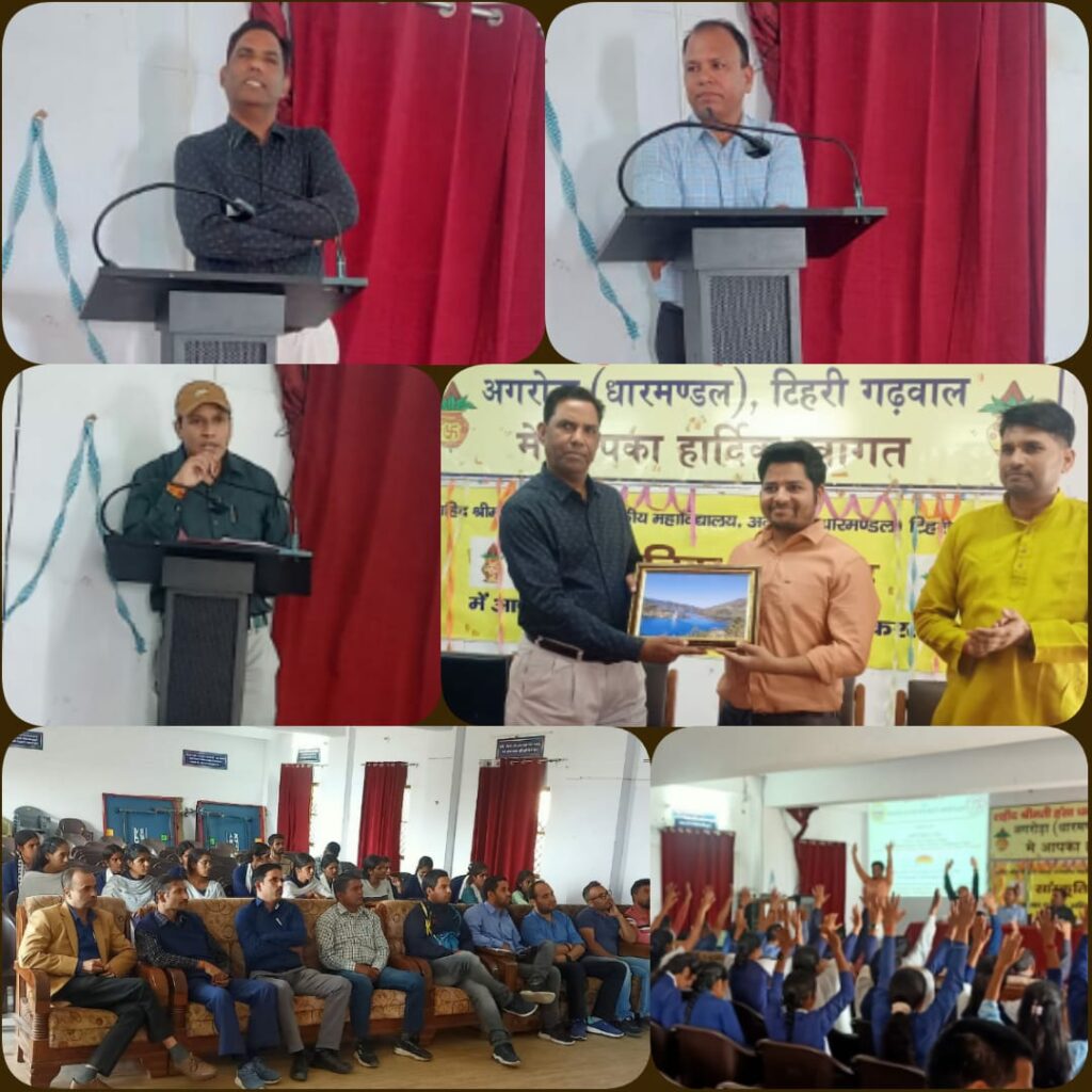 शहीद श्रीमती हंसा धनाई राजकीय महाविद्यालय अगरोड़ा, टिहरी गढ़वाल मे आज दिनांक 07 अक्टूबर 2024 को प्राचार्य डॉ० कै०एस० जौहरी तथा नोडल अधिकारी डॉ० भरत गिरी गोसाई के दिशा-निर्देशन मे महाविद्यालय एंटी ड्रग सेल तथा आर्ट ऑफ लिविंग संस्था के संयुक्त तत्वाधान मे नशा मुक्त भारत अभियान के अंतर्गत एक दिवसीय सेमिनार का आयोजन किया गया। सर्वप्रथम प्राचार्य, मुख्य वक्ताओ, समस्त प्राध्यापकों द्वारा मां शारदा के चित्र के सम्मुख दीप प्रज्वलित कर प्राचार्य द्वारा अतिथियों को पुष्प गुच्छ तथा स्मृति चिन्ह प्रदान कर महाविद्यालय के छात्राओं द्वारा सरस्वती वंदना तथा स्वागत गीत के साथ कार्यक्रम का शुभारंभ किया गया। कार्यक्रम को संबोधित करते हुए प्राचार्य डॉ० कै०एस० जौहरी ने कहा कि नशा एक ऐसी सामाजिक बुराई है जो हमारे संपूर्ण जीवन को नष्ट कर देती है। नशे की लत से पीड़ित व्यक्ति परिवार तथा समाज के लिए बोझ बन जाता है। नशा मुक्ति हमारे समाज के विकास के लिए अति आवश्यक है। उन्होंने सभी से अपील की कि खुद भी नशे से दूर रहे और दूसरों को भी नशा मुक्ति के लिए प्रेरित करे। कार्यक्रम का संचालन करते हुए नोडल अधिकारी- एंटी ड्रग सेल डॉ० भरत गिरी गोसाई ने पीपीटी के माध्यम से तंबाकू, धूम्रपान, मदिरापान के सेवन से स्वास्थ्य पर पड़ने वाले दुष्प्रभाव के बारे में विस्तृत रूप से छात्र-छात्राओं को अवगत कराया। इस दौरान उन्होंने कहा कि नशा समाज के लिए दीमक के समान है जो समय से पहले ही जीवन को समाप्त कर रहा है। नशीली पदार्थों के सेवन से व्यक्ति न केवल अपनी शारीरिक हानि करता है बल्कि अपने परिवार के साथ-साथ सामाजिक वातावरण को भी दूषित करता है। मुख्य वक्ता के रूप में आर्ट ऑफ लिविंग संस्था से आये हुई श्री शुभम पंवार तथा श्री त्रिलोक नारायण ने प्राणायाम तथा योग के माध्यम से नशे से कैसे बचा जा सकता है? इस विषय पर प्रयोगात्मक रूप से छात्र-छात्राओं को विस्तृत रूप से अवगत कराया। डॉ० अजय कुमार सिंह द्वारा प्राचार्य, मुख्य वक्ताओं, प्राध्यापको तथा सेमिनार में उपस्थित सभी छात्र-छात्राओ का धन्यवाद ज्ञापित किया गया। इस एक दिवसीय सेमिनार मे महाविद्यालय के समस्त प्राध्यापक, कर्मचारीगण तथा छात्र-छात्राएं उपस्थित रहे।