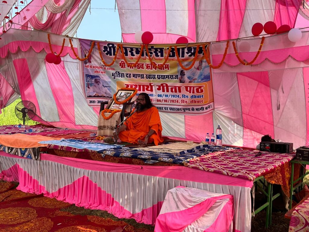 गंगा यमुना सरस्वती की पावन संगम पर बसा भगवान भरद्वाज, दुर्वासा ऋषि, व ऋषि पन्ना की ज्ञान स्थली प्रयागराज की पावन धरा पर श्री परमहंस आश्रम शक्तेषगढ़ से विश्व गुरु विश्व गौरव से सम्मानित कालजयी अलमस्त सर्वज्ञ सनातन संस्कृति के वाहक यथार्थ गीता के प्रणेता तत्व द्रष्टा महापुरुष परमहंस स्वामी श्री अड़गड़ानंद जी महाराज के शिष्य गण पधारे हैं। पूज्य गुरुदेव भगवान की कृपा व उनकी आज्ञा से ये शिष्य गण नव निर्मित श्री परमहंस आश्रम श्री मांडव ऋषि धाम मूर्तिहा दह मांडा खास में वैदिक मंत्रोच्चारण द्वारा त्रिशूल स्थापना किये । इस अवसर पर यथार्थ गीता पाठ , विशाल भंडारा व मुफ्त में यथार्थ गीता वितरण किया गया। हजारों की संख्या में भक्तगण उपस्थित रहे , उनको मुफ्त में पूज्य गुरुदेव भगवान द्वारा रचित भव सागर को पार करा देने वाली धार्मिक पुस्तकों को भी दिया गया। ज्ञातव्य हो कि पूज्य गुरुदेव भगवान का दो आश्रम प्रयागराज में हो चुका है। एक और आश्रम पावन पवित्र गंगा जी के तट पर श्री परमहंस आश्रम श्रृंगवेरपुर प्रयागराज में भी विगत कई वर्षों से पूज्य गुरुदेव भगवान की विद्या व गीतोक्त साधना का प्रचार प्रसार हो रहा है, और मानवता का कल्याण हो रहा है। इस आश्रम के महंत पूज्य गुरुदेव भगवान के शिष्य विजय महाराज जी ने बताया कि सब कुछ गुरुदेव भगवान की कृपा से सकुशल संपन्न हो गया। सत्संग प्रवचन में पूज्य श्री लाले महाराज जी ने हजारों की संख्या में उपस्थित श्रद्धालुओं भक्तों को बताया कि संत महापुरुषों के शरण सानिध्य से ही ईश्वरीय पथ प्राप्त होता है,। *संत संग अपवर्ग कर, कामी भव कर पंथ*। *कहहि संत कवि कोविद, श्रुति पुरान सद्ग्रंथ।।*
