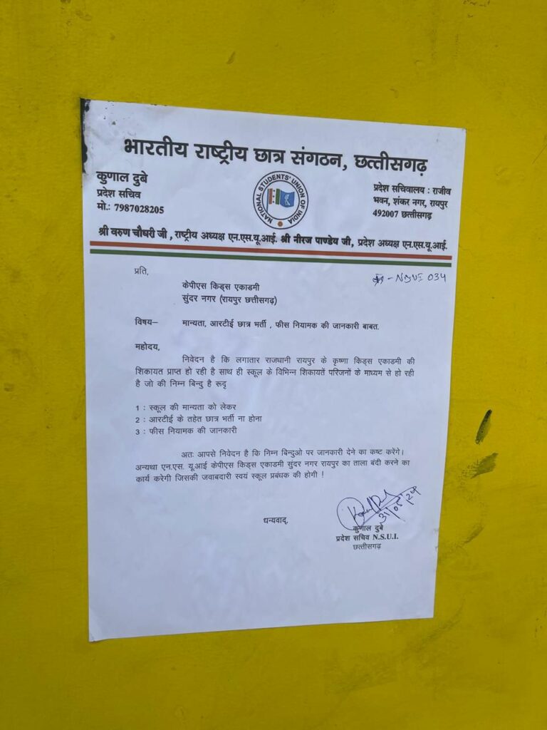 NSUI की छत्तीसगढ़ इकाई द्वारा लगातार राजधानी रायपुर के ग़ैर मान्यता वाले स्कूलों में प्रदर्शन किया जा रहा है प्रदेश सचिव कुणाल दुबे ने कहा कि प्रदेश में भाजपा सरकार आने के बाद प्राइवेट स्कूल संचालक मनमानी कर रहे है सैकड़ों स्कूल बिना मान्यता के संचालित हो रहे है जिनमें आरटीई के एक भी छात्र को भर्ती नहीं किया जा रहा है और न ही एफसे नियामक का पालन किया जा रहा है,पालको को धोखा देकर उनसे मोटी फ़ीस वसूली जा रही है,एनएसयूई आज सुंदरनगर रायपुर के ग़ैर मान्यता वाले कृष्णा किड्स एकाडमी में पहुँचा जहां की प्रिंसिपल ने फ़ोन में बताया कि उन्हें मान्यता लेने की आवश्यकता नहीं है और न ही आरटीई के छात्र उनके स्कूल में है,इस स्कूल में लगभग दो सौ से ज़्यादा बच्चे है जिनके खेलने के लिये मैदान उस स्कूल में नहीं है,एनएसयूई की टीम ने स्कूल में अपना ज्ञापन लगा कर स्कूल बंद करने की माँग की है आज के प्रदर्शन में विशाल मानिकपुरी पूर्व विधानसभा अध्यक्ष,शुभम् शर्मा ज़िला सचिव ,तनिष्क मिश्रा विधानसभा महासचिव , अभिनव बंधे विधानसभा सचिव , कृष्ण मंगतानी उपस्थित थे
