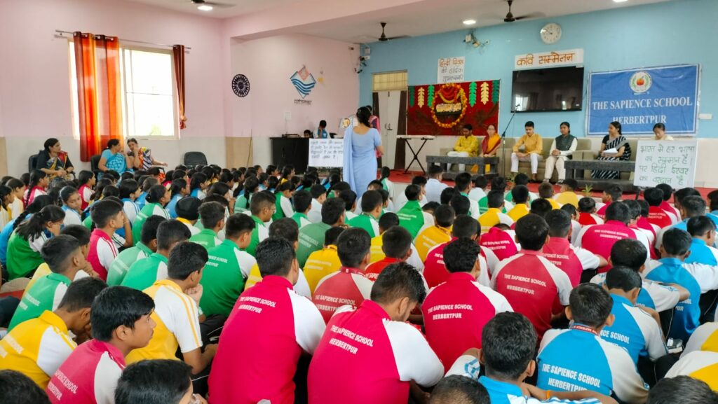 आज दिनांक 14 सितंबर को सेपियंस विद्यालय विकास नगर तथा हरबर्टपुर में हिंदी दिवस के उपलक्ष्य में विशेष प्रार्थना सभा आयोजित की गई। जिसमें विद्यालय के लगभग सभी कक्षाओं के विद्यार्थियों ने प्रतिभाग किया। उन्होंने कविता वाचन, कहानी वाचन, विचार , समाचार, गीत, श्लोक , प्रश्नोत्तरी, पोस्टर तथा नारों के माध्यम से हिंदी भाषा के प्रति अपने विचारों से उपस्थित सभी छात्रों तथा अध्यापकों को अवगत कराया ।