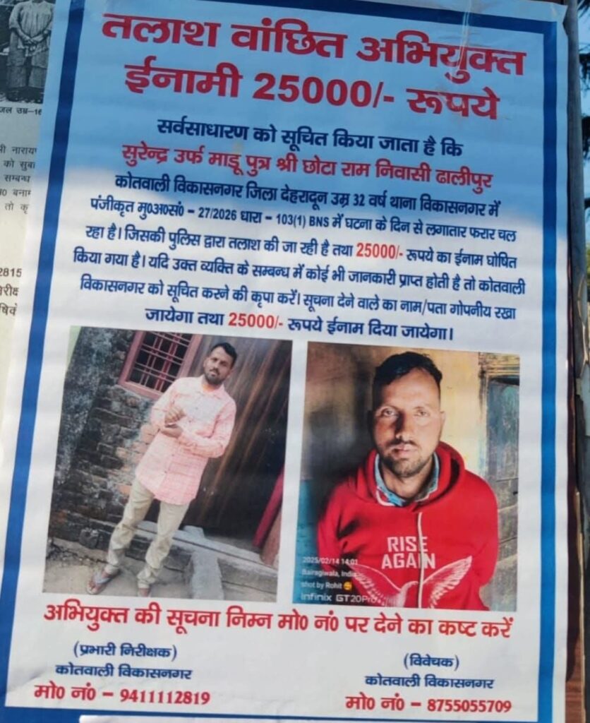 कोतवाली विकासनगर पुलिस ने एक फरार अभियुक्त की गिरफ्तारी के लिए ₹25,000 का इनाम घोषित किया है। पुलिस द्वारा जारी पोस्टर के अनुसार, सुरेंद्र उर्फ माई पुत्र श्री छोटा राम, निवासी ढालीपुर, थाना विकासनगर, जनपद देहरादून, उम्र लगभग 32 वर्ष, लंबे समय से फरार चल रहा है।